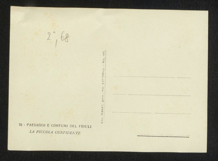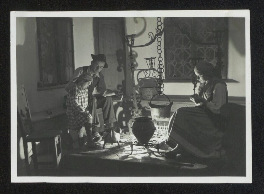 Lo scatto di Umberto Antonelli, farmacista e fotografo attivo in Carnia tra 1909 e 1949, è parte della serie di cartoline pubblicate dal fotografo editore Carlo Pignat con il titolo "Paesaggi e Costumi del Friuli" nella seconda metà degli anni Trenta del Novecento, raffiguranti tutte una Carnia e un Friuli arcadici. L'immagine ritrae una famiglia in abiti tradizionali carnici, davanti al "fogolar" all'interno di casa Toscjanas a Enemonzo. L'uomo è Italo Luciano Bearzi, che fece da modello per numerose delle immagini della serie fotografica.