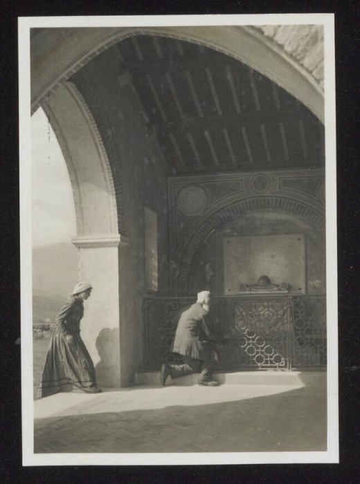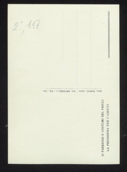 Lo scatto di Umberto Antonelli, farmacista e fotografo attivo in Carnia tra 1909 e 1949, è parte della serie di cartoline pubblicate dal fotografo editore Carlo Pignat con il titolo "Paesaggi e Costumi del Friuli" nella seconda metà degli anni Trenta del Novecento, raffiguranti tutte una Carnia e un Friuli arcadici. Nell'immagine sono ritratti una donna con i costumi tradizionali festivi friulani e un'anziano signore inginocchiato davanti alla lapide per i caduti della prima guerra mondiale, nella Chiesa di Sant'Eufemia a Segnacco di Tarcento.