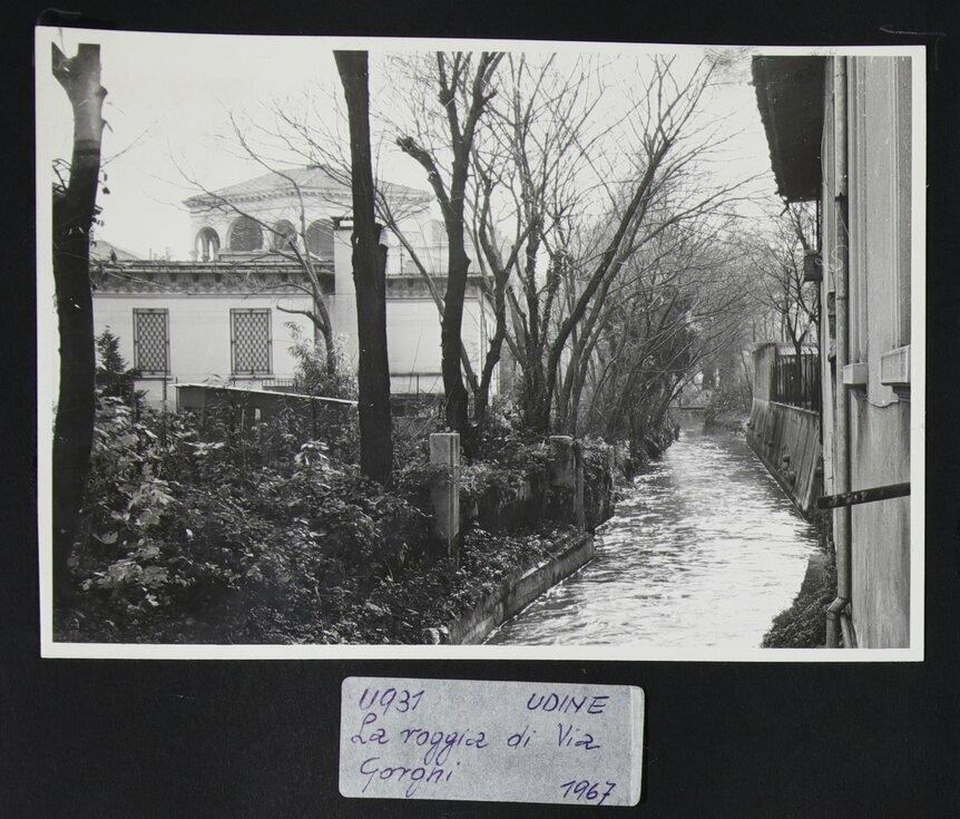Udine: veduta di via Gorghi con la roggia e filare di alberi.