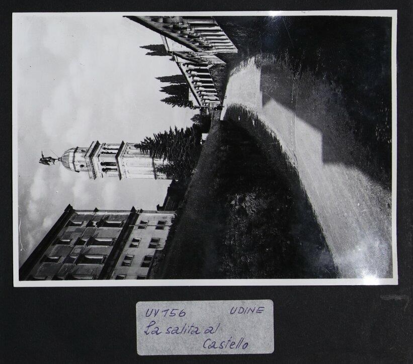 Udine: veduta della salita da piazza Libertà al castello. Verso il centro, il campanile cinquecentesco della chiesa di Santa Maria di Castello, progettato da Gaspare Negro. In cima alla cupola emisferica, portata a termine da Giovanni da Udine, la scultura dorata e girevole con l'arcangelo Gabriele. A sinistra, parte del castello. A destra, il porticato ad elementi sfalsati, in stile tardogotico veneziano, voluto dal luogotenente Tommaso Lippomano (1486).