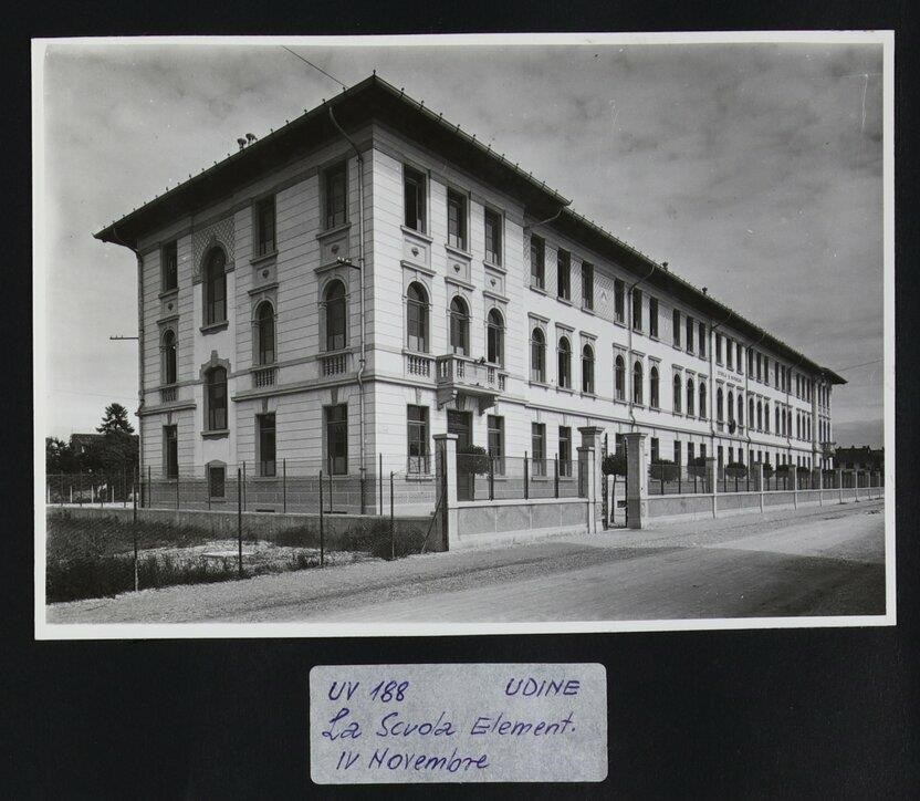 Udine: scuola elementare "IV Novembre". Un tempo l'edificio accoglieva la Scuola di San Domenico afferente al convento delle Suore Domenicane, in “Braida Torriani“. Tra il 1926 e il 1930 l'edificio venne ampliato. Negli anni Trenta la denominazione "Benito Mussolini" diventò "IV Novembre".