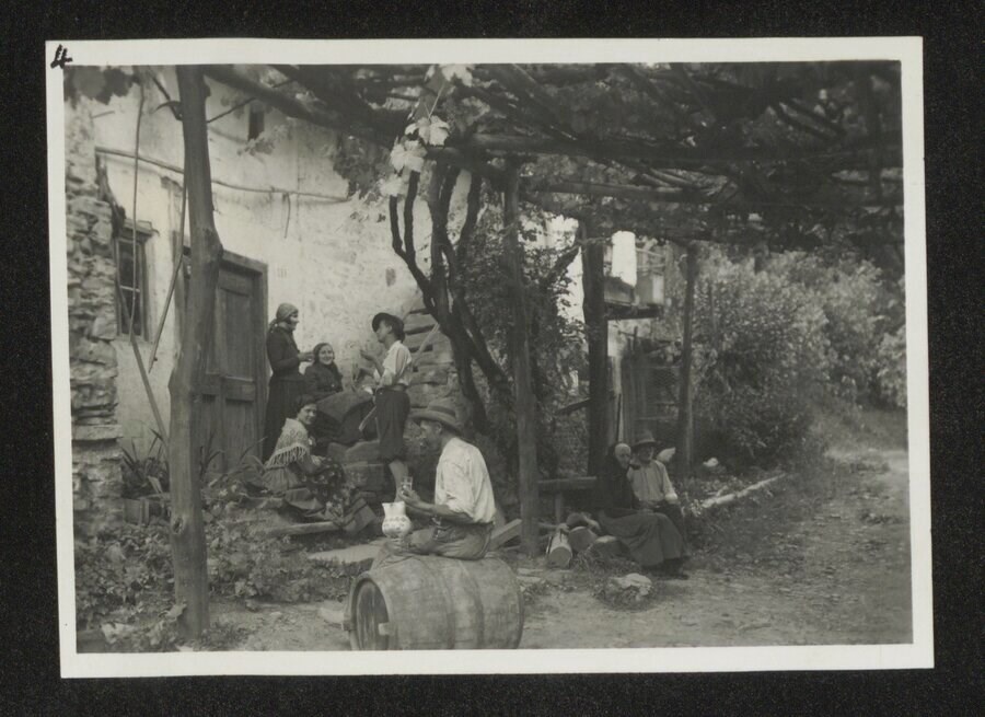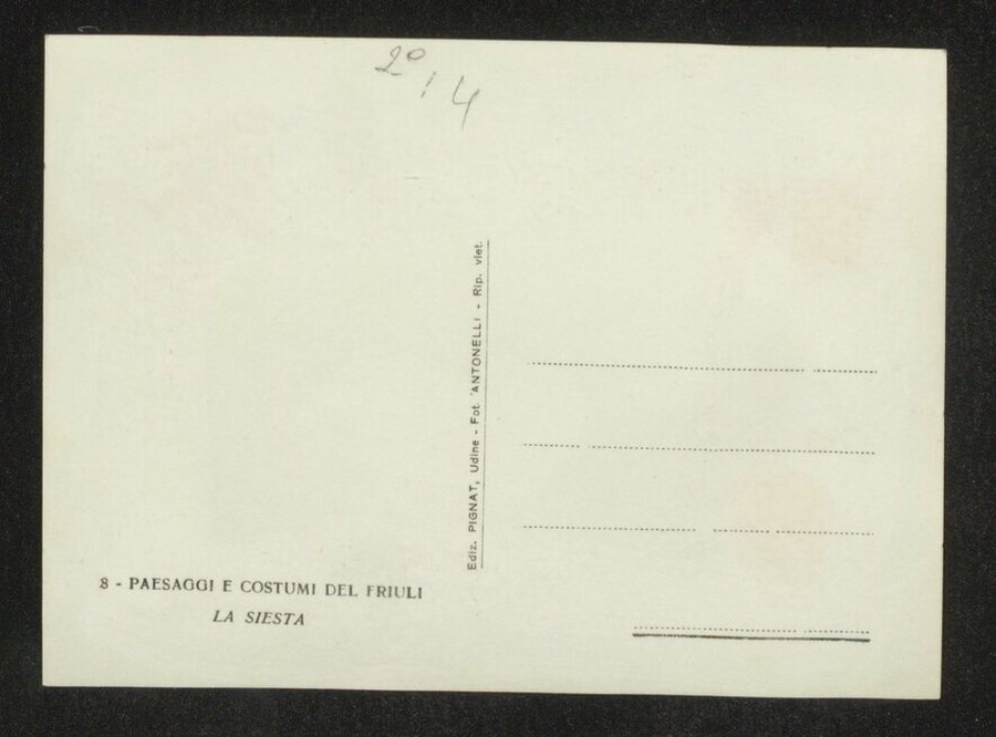 Lo scatto di Umberto Antonelli, farmacista e fotografo attivo in Carnia tra 1909 e 1949, è parte della serie di cartoline pubblicate dal fotografo editore Carlo Pignat con il titolo "Paesaggi e Costumi del Friuli" nella seconda metà degli anni Trenta del Novecento, raffiguranti tutte una Carnia e un Friuli arcadici. L'immagine ritrae un gruppo di persone in costumi tradizionali friulani che conversa sulla scala sotto una pergola. La seconda donna seduta è Aurelia Frucco, l'uomo in piedi con il capello è Italo Luciano Bearzi.