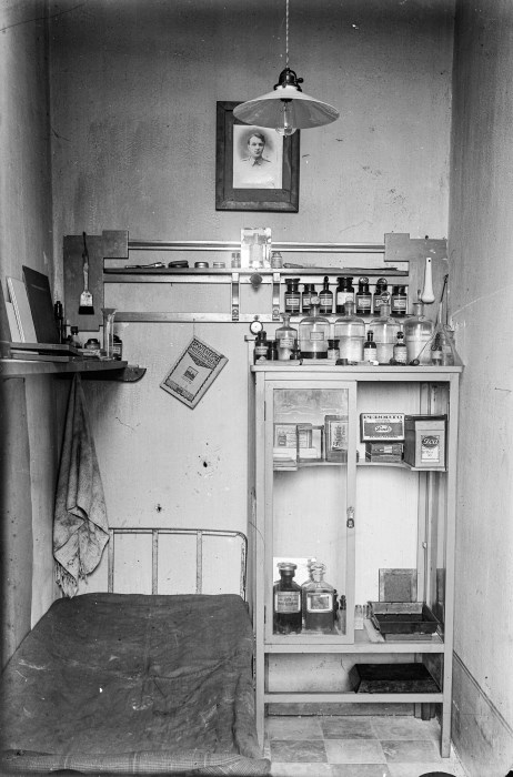 Scatto che regala un'immagine della piccola stanza del fotografo-soldato: un piccolo letto a sinistra; a cornice di esso tutte le attrezzature ben ordinate su un paio di mensole e in una vetrina: chassis, scatole per lastre negative, vaschette e tutte le chimiche necessarie. In alto una cornice con una fotografia, probabilmente lo stesso fotografo. Appesa al muro la rivista "Wiener mitteilungen photographishen inhalts", rivista mensile viennese dedicata ai fotografi ed alle attrezzatture fotografiche, databile al 1911.