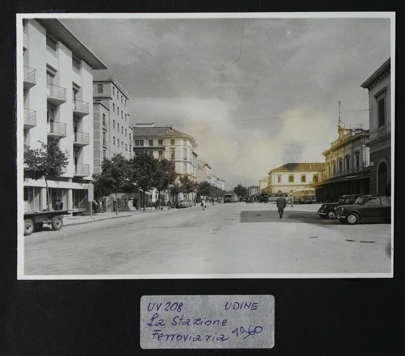 Udine: veduta di viale Europa Unita. In secondo piano a destra, la stazione ferroviaria e, a sinistra, l'hotel Europa. In primo piano a sinistra e a destra, un carro e due automobili d'epoca. In secondo piano, a destra, alcuni mezzi di trasporto pubblico.