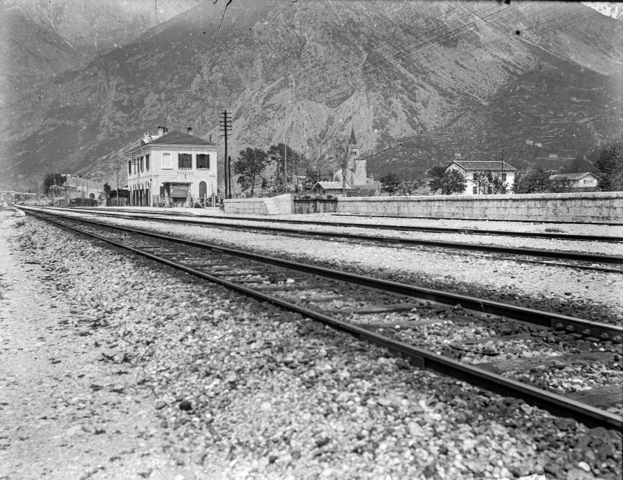 Veduta dei binari, della stazione ferroviaria di Venzone e delle montagne sullo sfondo.