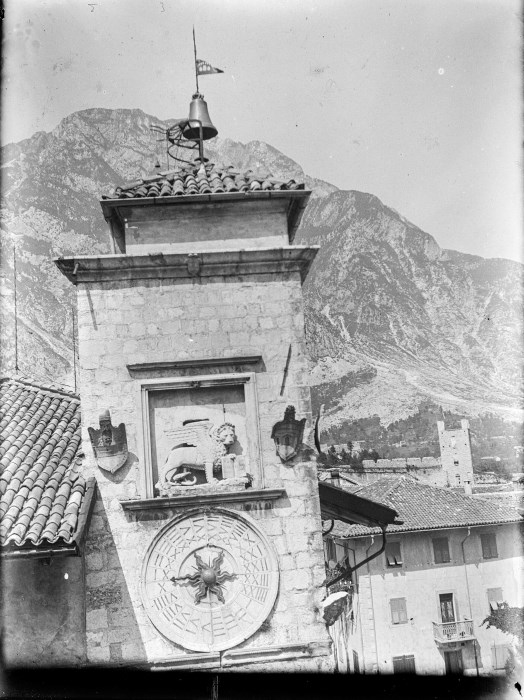 Veduta della torre dell'orologio del Palazzo comunale di Venzone; il quadrante dell'orologio è accompagnato dal bassorilievo sovrastante del leone veneziano di San Marco, due stemmi ed, in alto, la campana. Il punto di ripresa è evidente provenga da un palazzo che si trova di fronte al soggetto.