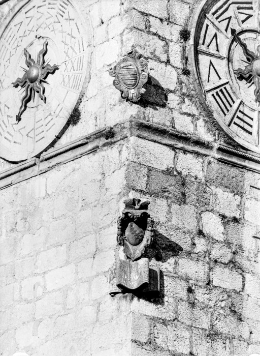 Spigolo della torre dell'orologio del Palazzo comunale di Venzone con i due quadranti degli orologi su entrambe le facciate e altorilievi di stemmi.