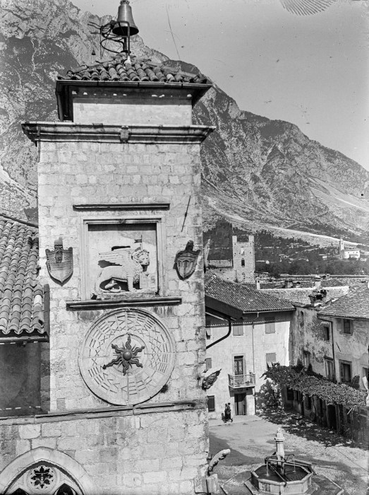 Veduta della torre dell'orologio del Palazzo comunale di Venzone; il quadrante dell'orologio è accompagnato dal bassorilievo sovrastante del leone veneziano di San Marco, due stemmi ed, in alto, la campana. Il punto di ripresa è evidente provenga da un palazzo che si trova di fronte al soggetto. Sullo sfondo Monte San Simeone, Piazza Municipio con la fontana.