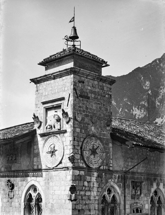 Veduta della torre dell'orologio del Palazzo comunale di Venzone; il quadrante dell'orologio è accompagnato dal bassorilievo sovrastante del leone veneziano di San Marco, due stemmi ed, in alto, la campana. Il punto di ripresa è evidente provenga da un palazzo che si trova di fronte al soggetto.