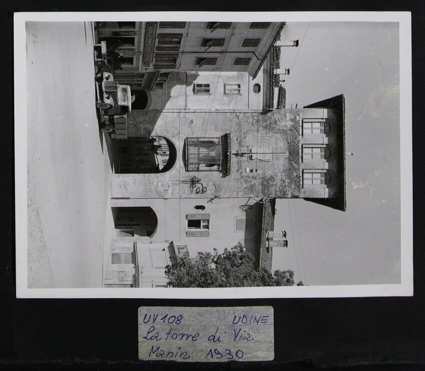 Udine: veduta di Porta Manin, o Torre di San Bartolomeo (fine del Duecento). Faceva parte della terza cerchia muraria. A sinistra, un'insegna che riporta la dicitura "Vulcanizzazione". A sinistra, un camion della Wehrmacht.