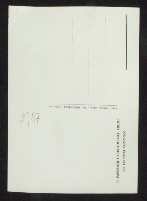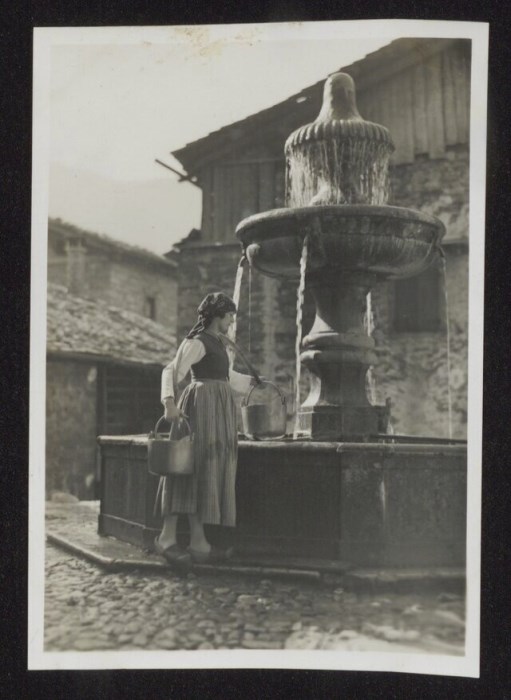 Lo scatto di Umberto Antonelli, farmacista e fotografo attivo in Carnia tra 1909 e 1949, è parte della serie di cartoline pubblicate dal fotografo editore Carlo Pignat con il titolo "Paesaggi e Costumi del Friuli" nella seconda metà degli anni Trenta del Novecento, raffiguranti tutte una Carnia e un Friuli arcadici. L'immagine ritrae una donna con i costumi tradizionali carnici mentre prende l'acqua dalla fontana di Tredolo a Forni di Sotto con il classico arconcello e i due secchi di rame.