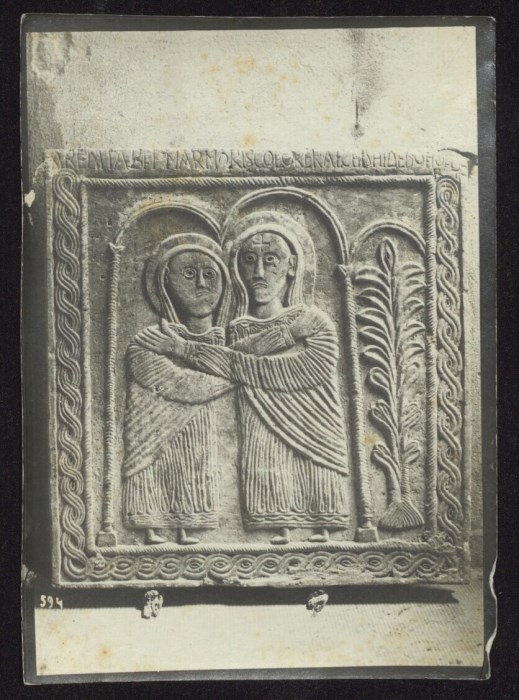 Riproduzione fotografica del particolare laterale in pietra di Aurisina dell'Ara di Ratchis, ora conservato presso il Museo Cristiano e Tesoro del Duomo a Cividale del Friuli. Nel bassorilievo a sinistra Elisabetta in visita alla cugina Maria. La Vergine è connotata da una croce incisa sulla fronte.