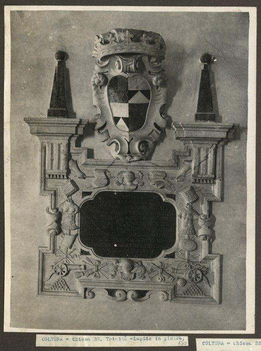 Riproduzione fotografica di una lapide in pietra con bassorilievi, stemma e iscrizioni su di una parete all'interno del Santuario della Santissima Trinità a Coltura di Polcenigo.