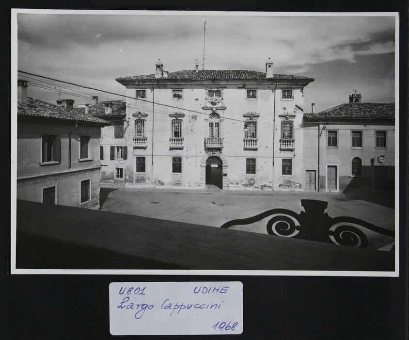 Udine, Largo dei Cappuccini: facciata di Palazzo Cassini-Camucio-del Torso (Fine del Seicento). Lo scatto è stato eseguito da un edificio collocato di fronte. Dal 1925 all'inizio della seconda guerra mondiale il proprietario fu Luciano Del Torso. L'edificio non presenta ancora l'intonacatura che verrà realizzata nel secondo Novecento. Caratterizzano la facciata il portale bugnato, le quattro finestre con balaustra e architrave e la porta finestra con mascherone.