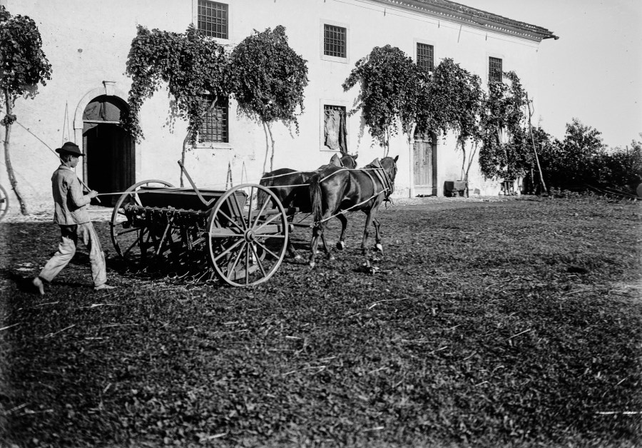 Due cavalli trainano una seminatrice diretta da un giovane contadino nel cortile di una casa friulana.