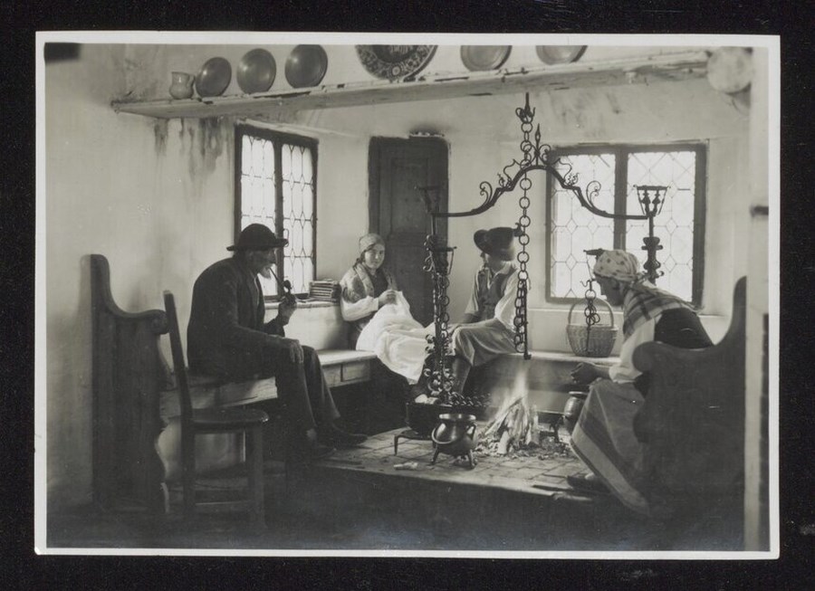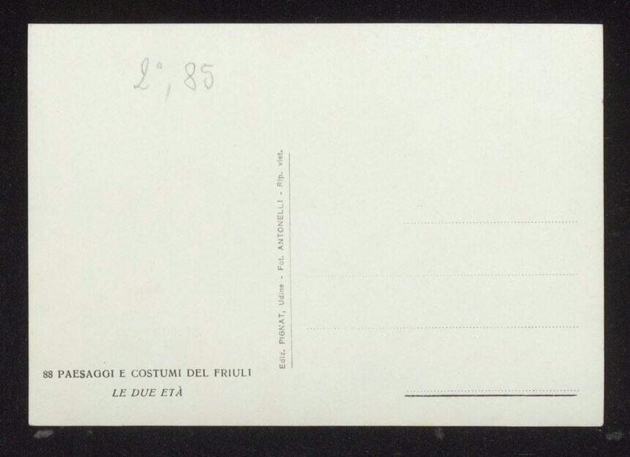 Lo scatto di Umberto Antonelli, farmacista e fotografo attivo in Carnia tra 1909 e 1949, è parte della serie di cartoline pubblicate dal fotografo editore Carlo Pignat con il titolo "Paesaggi e Costumi del Friuli" nella seconda metà degli anni Trenta del Novecento, raffiguranti tutte una Carnia e un Friuli arcadici. L'immagine ritrae una famiglia con i costumi tradizionali carnici raccolta intorno al "fogolar" all'interno della casa Toscjanas a Enemonzo (demolita dopo il terremoto del 1976). L'uomo con la pipa è il Sig. Sovrano, l'altro è Italo Lucinao Bearzi. La ricamatrice è la Signora Augusta, mentre la donna di spalle è Ines Corradina.