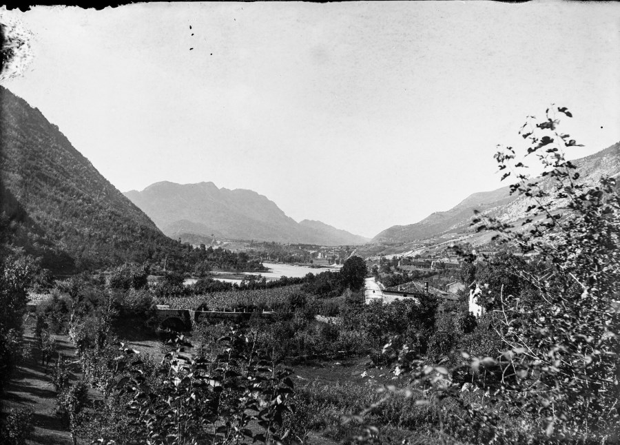 Veduta del greto di un torrente fra le montagne della Carnia. Un piccolo ponte, alcune abitazioni e una strada sterrata con un passante caratterizzano l'immagine.