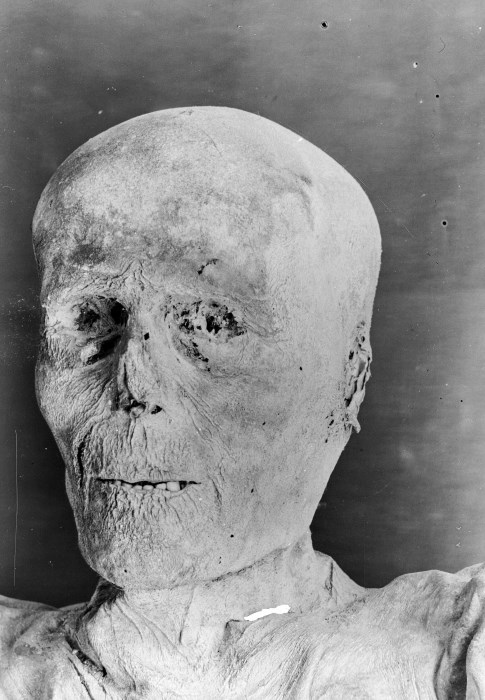 Riproduzione fotografica di una delle mummie conservate presso la Rotonda di San Michele nella Cappella superiore del Duomo di Venzone, in particolare del viso. Le salme risalgono a un’epoca che va dal 1348 al 1881, anno in cui il cimitero all’interno del Duomo è stato bonificato e collocato nel sito attuale, fuori dal Centro Storico. La mummificazione naturale delle Mummie di Venzone si deve a particolari condizioni ambientali che si verificarono in alcune tombe del Duomo nelle quali si sviluppò la Hypha bombicina Pers, una muffa con la proprietà di disidratare i tessuti inibendone la decomposizione.