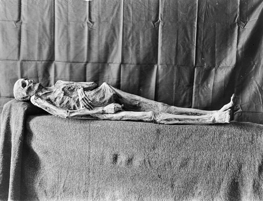 Una delle Mummie di Venzone adagiata su un giaciglio coperto da un panno. Nel 1647, durante i lavori di ampliamento del duomo di Venzone, vennero alla luce una ventina di corpi mummificati; appartengono ad un'epoca compresa tra il 1348 e il 1881. Dopo il sisma del 1976 furono estratte dalle macerie solo 15 delle 21 mummie conservate.