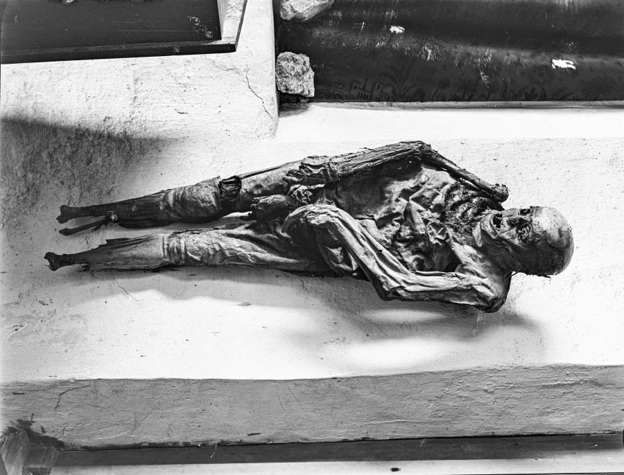 Una delle Mummie di Venzone adagiata su un giaciglio in muratura. Nel 1647, durante i lavori di ampliamento del duomo di Venzone, vennero alla luce una ventina di corpi mummificati; appartengono ad un'epoca compresa tra il 1348 e il 1881. Dopo il sisma del 1976 furono estratte dalle macerie solo 15 delle 21 mummie conservate.