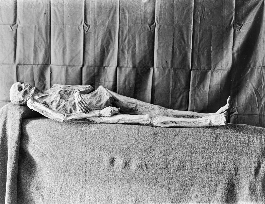 Una delle Mummie di Venzone adagiata su un giaciglio coperto da un panno. Nel 1647, durante i lavori di ampliamento del duomo di Venzone, vennero alla luce una ventina di corpi mummificati; appartengono ad un'epoca compresa tra il 1348 e il 1881. Dopo il sisma del 1976 furono estratte dalle macerie solo 15 delle 21 mummie conservate.