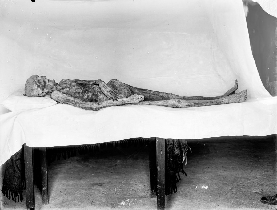 Riproduzione fotografica di una delle mummie conservate presso la Rotonda di San Michele nella Cappella superiore del Duomo di Venzone, nell'immagine adagiata su un telo bianco. Le salme risalgono a un’epoca che va dal 1348 al 1881, anno in cui il cimitero all’interno del Duomo è stato bonificato e collocato nel sito attuale, fuori dal Centro Storico. La mummificazione naturale delle Mummie di Venzone si deve a particolari condizioni ambientali che si verificarono in alcune tombe del Duomo nelle quali si sviluppò la Hypha bombicina Pers, una muffa con la proprietà di disidratare i tessuti inibendone la decomposizione.