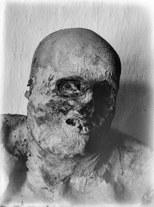Riproduzione fotografica della testa di una delle mummie conservate presso la Rotonda di San Michele nella Cappella superiore del Duomo di Venzone. Le salme risalgono a un’epoca che va dal 1348 al 1881, anno in cui il cimitero all’interno del Duomo è stato bonificato e collocato nel sito attuale, fuori dal Centro Storico. La mummificazione naturale delle Mummie di Venzone si deve a particolari condizioni ambientali che si verificarono in alcune tombe del Duomo nelle quali si sviluppò la Hypha bombicina Pers, una muffa con la proprietà di disidratare i tessuti inibendone la decomposizione.
