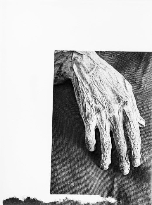 Riproduzione fotografica della mano di una delle mummie conservate presso la Rotonda di San Michele nella Cappella superiore del Duomo di Venzone. Le salme risalgono a un’epoca che va dal 1348 al 1881, anno in cui il cimitero all’interno del Duomo è stato bonificato e collocato nel sito attuale, fuori dal Centro Storico. La mummificazione naturale delle Mummie di Venzone si deve a particolari condizioni ambientali che si verificarono in alcune tombe del Duomo nelle quali si sviluppò la Hypha bombicina Pers, una muffa con la proprietà di disidratare i tessuti inibendone la decomposizione.