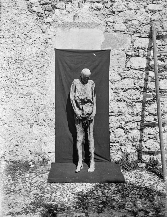 Riproduzione fotografica di una delle mummie conservate presso la Rotonda di San Michele nella Cappella superiore del Duomo di Venzone, nell'immagine adagiata in verticale su una tela nera in esterno. Le salme risalgono a un’epoca che va dal 1348 al 1881, anno in cui il cimitero all’interno del Duomo è stato bonificato e collocato nel sito attuale, fuori dal Centro Storico. La mummificazione naturale delle Mummie di Venzone si deve a particolari condizioni ambientali che si verificarono in alcune tombe del Duomo nelle quali si sviluppò la Hypha bombicina Pers, una muffa con la proprietà di disidratare i tessuti inibendone la decomposizione.
