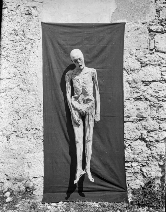 Riproduzione fotografica di una delle mummie conservate presso la Rotonda di San Michele nella Cappella superiore del Duomo di Venzone, nell'immagine adagiata in verticale su una tela nera in esterno. Le salme risalgono a un’epoca che va dal 1348 al 1881, anno in cui il cimitero all’interno del Duomo è stato bonificato e collocato nel sito attuale, fuori dal Centro Storico. La mummificazione naturale delle Mummie di Venzone si deve a particolari condizioni ambientali che si verificarono in alcune tombe del Duomo nelle quali si sviluppò la Hypha bombicina Pers, una muffa con la proprietà di disidratare i tessuti inibendone la decomposizione.