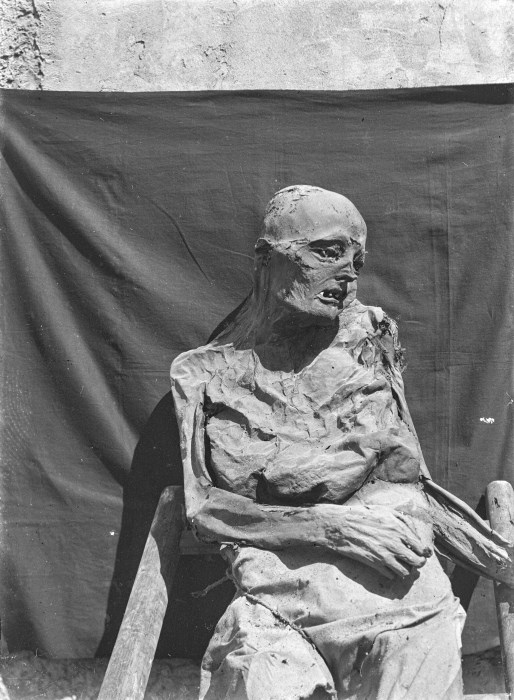Riproduzione fotografica di una delle mummie conservate presso la Rotonda di San Michele nella Cappella superiore del Duomo di Venzone, nell'immagine appoggiata ad un fondo scuro e ad una struttura lignea. Le salme risalgono a un’epoca che va dal 1348 al 1881, anno in cui il cimitero all’interno del Duomo è stato bonificato e collocato nel sito attuale, fuori dal Centro Storico. La mummificazione naturale delle Mummie di Venzone si deve a particolari condizioni ambientali che si verificarono in alcune tombe del Duomo nelle quali si sviluppò la Hypha bombicina Pers, una muffa con la proprietà di disidratare i tessuti inibendone la decomposizione.