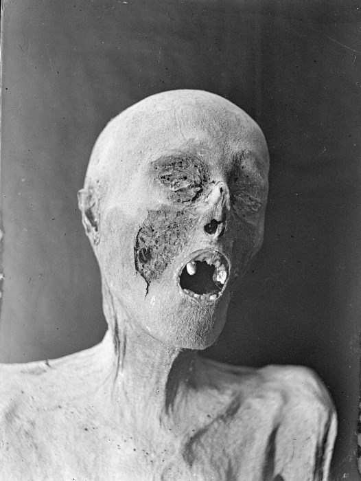 Riproduzione fotografica del viso di una delle mummie conservate presso la Rotonda di San Michele nella Cappella superiore del Duomo di Venzone, Le salme risalgono a un’epoca che va dal 1348 al 1881, anno in cui il cimitero all’interno del Duomo è stato bonificato e collocato nel sito attuale, fuori dal Centro Storico. La mummificazione naturale delle Mummie di Venzone si deve a particolari condizioni ambientali che si verificarono in alcune tombe del Duomo nelle quali si sviluppò la Hypha bombicina Pers, una muffa con la proprietà di disidratare i tessuti inibendone la decomposizione.