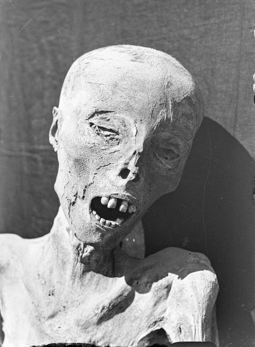 Riproduzione fotografica del viso di una delle mummie conservate presso la Rotonda di San Michele nella Cappella superiore del Duomo di Venzone, Le salme risalgono a un’epoca che va dal 1348 al 1881, anno in cui il cimitero all’interno del Duomo è stato bonificato e collocato nel sito attuale, fuori dal Centro Storico. La mummificazione naturale delle Mummie di Venzone si deve a particolari condizioni ambientali che si verificarono in alcune tombe del Duomo nelle quali si sviluppò la Hypha bombicina Pers, una muffa con la proprietà di disidratare i tessuti inibendone la decomposizione.