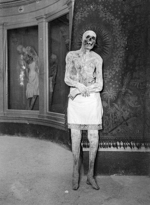 Riproduzione fotografica di una delle mummie conservate presso la Rotonda di San Michele nella Cappella superiore del Duomo di Venzone. Le salme risalgono a un’epoca che va dal 1348 al 1881, anno in cui il cimitero all’interno del Duomo è stato bonificato e collocato nel sito attuale, fuori dal Centro Storico. La mummificazione naturale delle Mummie di Venzone si deve a particolari condizioni ambientali che si verificarono in alcune tombe del Duomo nelle quali si sviluppò la Hypha bombicina Pers, una muffa con la proprietà di disidratare i tessuti inibendone la decomposizione.