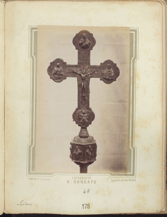 Riproduzione fotografica di una croce astile appartenente al Tesoro della Chiesa di Santa Maria Assunta di Lestans, frazione del Comune di Sequals. Si tratta del fronte della croce processionale. Il verso è riprodotto nell'immagine successiva in album (ID 843). Qui, nel fronte della croce, l'iconografia prevede il Cristo passo, con il Padreterno benedicente nel lobo superiore della croce, un angelo con cartiglio nel lobo inferiore e due figure di santi nei lobi laterali.
