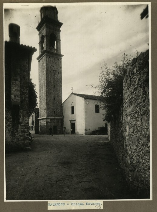 Veduta dell'esterno della Chiesa di San Pellegrino con annesso campanile a Navarons di Meduno; il punto di vista è lontano rispetto alla facciata, proprio per poter riprendere anche la torre campanaria a pianta quadrata. Nell'immagine sono visibili dei bambini giocosi sullo spiazzo della chiesa.