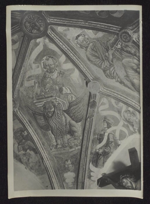 Affresco raffigurante gli evangelisti San Marco e Luca nella sagrestia della Chiesa di S. Vito e Crescenzia Martiri a Liariis di Ovaro a opera di Pietro Foluto da Tolmezzo nel XVI secolo. In basso a destra uno scorcio di un crocifisso.