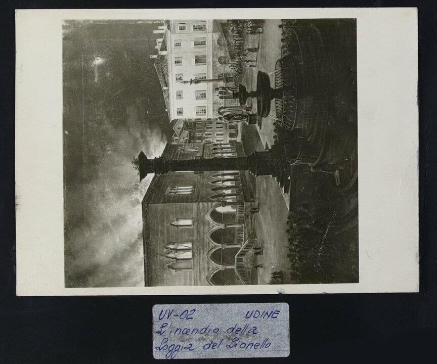 Udine: piazza Contarena (piazza Libertà) il 19 febbraio 1876. In primo piano, la fontana di Giovanni Carrara (anni Quaranta del Cinquecento). Subito dietro, al centro, la colonna corinizia (1539): si noti che non è ancora stato realizzato il leone della Repubblica di Venezia, che verrà posizionato sulla sopracitata colonna nel 1883. In secondo piano, le statue seicentesche di Ercole e di Caco in pietra d'Aurisina, realizzate dallo scultore Angelo de Putti. In secondo piano, a sinistra, la Loggia del Lionello, finita di costruire per volere di Nicolò Lionello. Una moltitudine di persone assiste all'incendio della Loggia, che si nota dal bagliore che l'edificio sprigiona dall'interno.