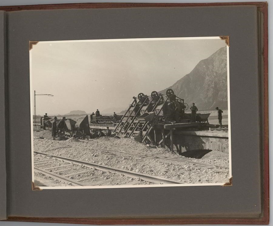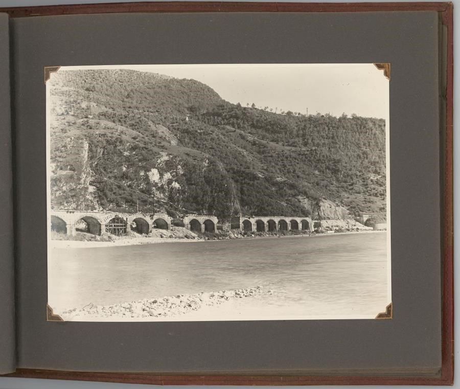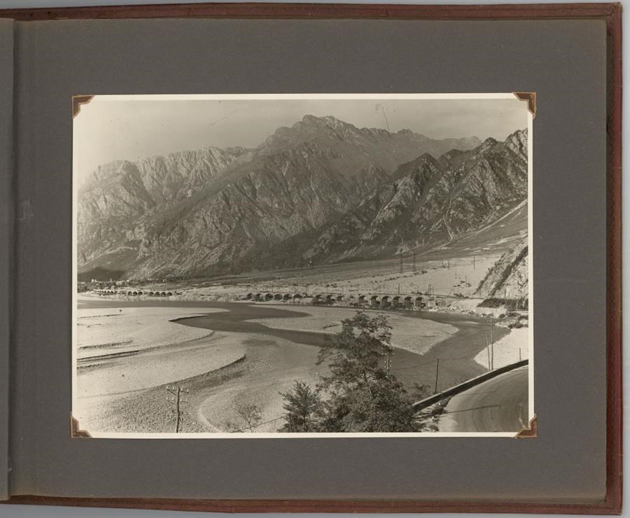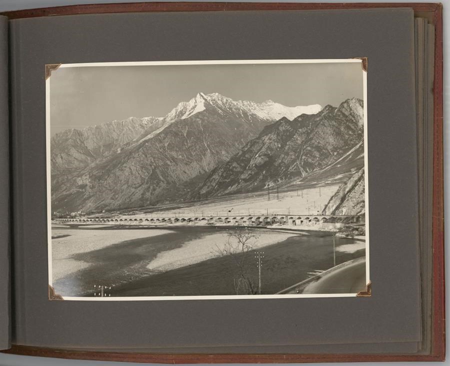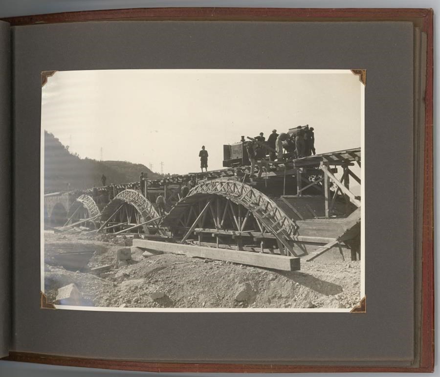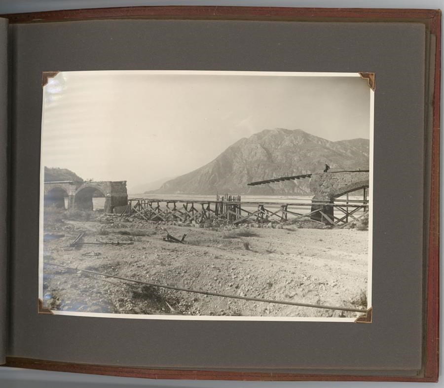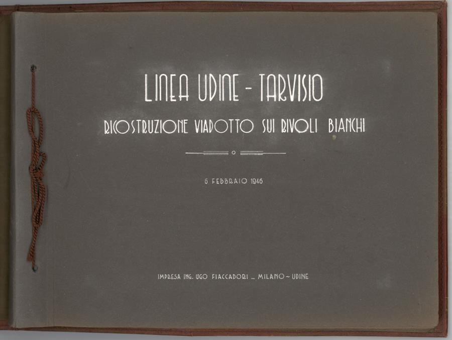 Album predisposto dall'Impresa ing. Ugo Fiaccadori (Milano-Udine) in occasione dei lavori di ricostruzione del ponte viadotto della Ferrovia Pontebbana sui Rivoli Bianchi, che costeggia il fiume Tagliamento, tra Gemona del Friuli e Venzone, danneggiato durante la Seconda Guerra Mondiale. L'album si compone di 12 positivi in bianco e nero, 180x240 mm. ciascuno, che documentano lo stato di fatto e le attività dell'impresa nei lavori di ripristino. Il ponte viadotto sui Rivoli Bianchi, nel secondo tronco della linea ferroviaria che collegava Udine a Pontebba (dove fino alla fine della Prima Guerra Mondiale si collocava il confine austriaco) ed il cui tracciato completo venne inaugurato il 30 ottobre 1879, era formato da 33 archi di 12 metri ciascuno, per una lunghezza complessiva di 783 metri. L'album contiene altri 2 positivi di medesimo formato dei precedenti, evidentemente non riferiti ai lavori ai Rivoli Bianchi, che ritraggono altri ponti sulla medesima linea ferroviaria.