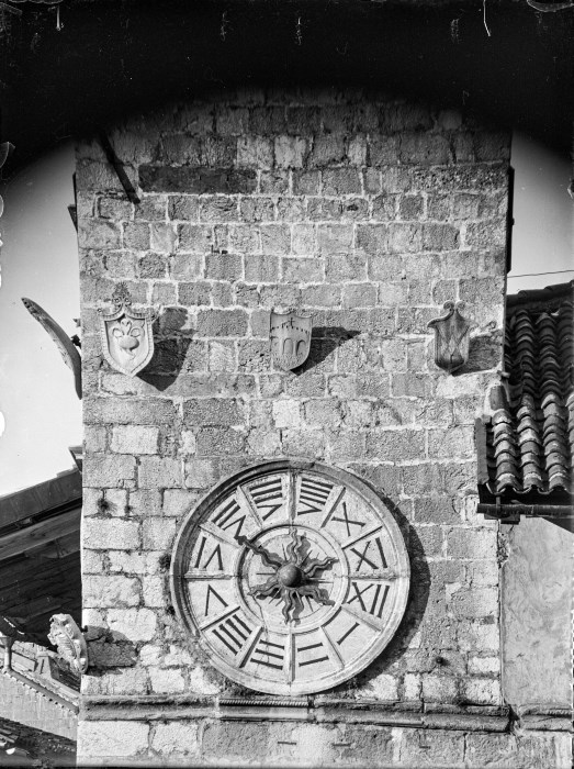 Dettaglio della torre dell'orologio del Palazzo comunale di Venzone: nello scorcio il quadrante dell'orologio e degli stemmi.
