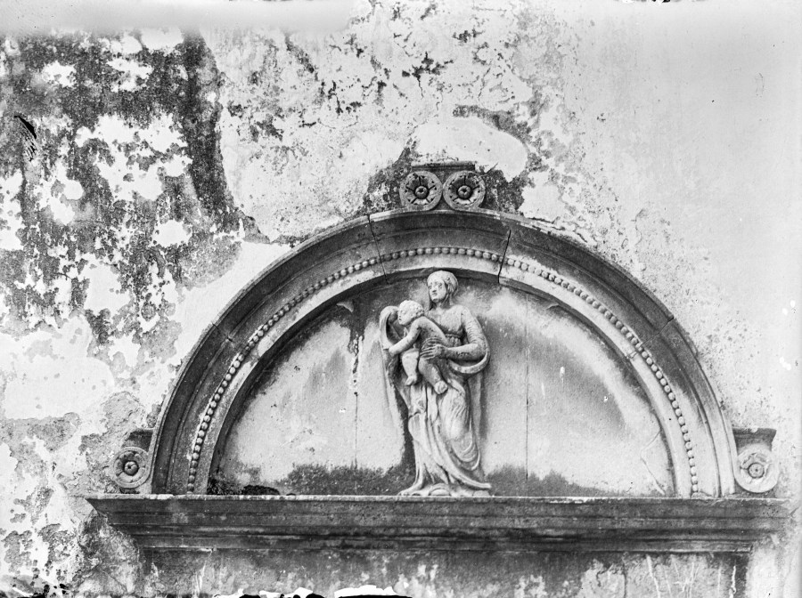 Riproduzione fotografica di una lunetta di u portale raffigurante una una "Madonna con Bambino" in un edificio a Venzone.