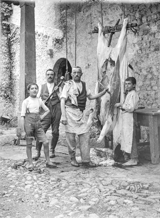 Ritratto di due uomini e due bambini dopo l'uccisione del maiale e la sua macellazione appeso alle loro spalle in un cortile.