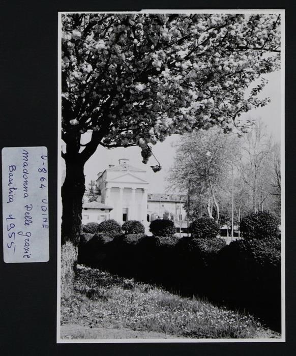 Udine, piazza I Maggio: veduta del santuario della Beata Vergine delle Grazie. Il pronao (1838-1841, 1850-1851), con timpano e quattro colonne (in pietra bianca di Brioni), è stato progettato dall'architetto Valentino Presani. In primo piano a sinistra, un ciliegio. Vicino scorre la roggia di Udine.