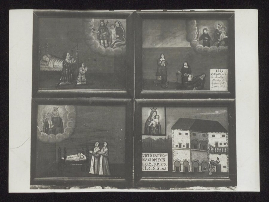 Quattro ex-voto presenti nel Santuario della Madonna di Trava, dipinti nella seconda metà del XVII secolo, come dipinti in cui è raffigurato l'evento a cui si riferisce la grazia ricevuta. Eretto verso il 1660 su un precedente edificio del sec. XIV, il Santuario di Trava divenne frequentatissimo perché si riteneva che la Madonna qui concedesse un breve tempo di vita ai bambini nati morti, in modo da poter essere battezzati, così da poter essere sepolti in terra consacrata ed accedere alla vita eterna, diversamente loro preclusa.