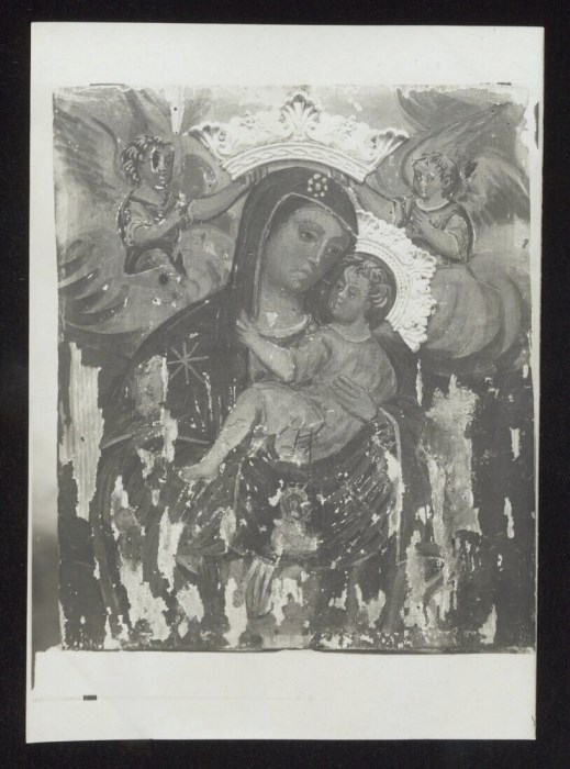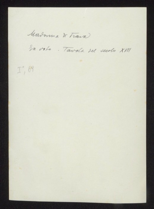 Secondo la didascalia sul verso della fotografia, ex-voto nel Santuario della Madonna di Trava, dipinto nel XVII secolo, con raffigurata la Vergine con in braccio il Bambino: l'aureola della Madonna, in rilievo come quella di Gesù, è sorretta da due angeli. Costruito verso il 1660 su un precedente edificio del sec. XIV, il Santuario di Trava divenne frequentatissimo perché si riteneva che la Madonna qui concedesse un breve tempo di vita ai bambini nati morti, in modo da poter essere battezzati, così da poter essere sepolti in terra consacrata ed accedere alla vita eterna, diversamente loro preclusa.
