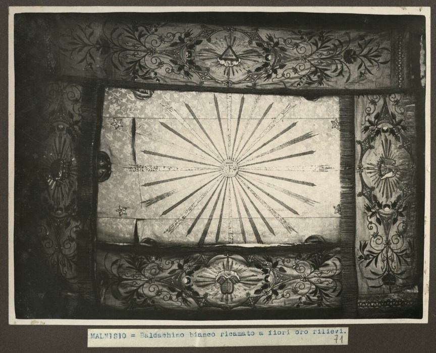 Immagine che ritrae il tessuto per il baldacchino processionale: bianco con fiori ricamati ad oro, conservato presso la Chiesa di San Giovanni Battista a Malnisio di Montereale Valcellina.