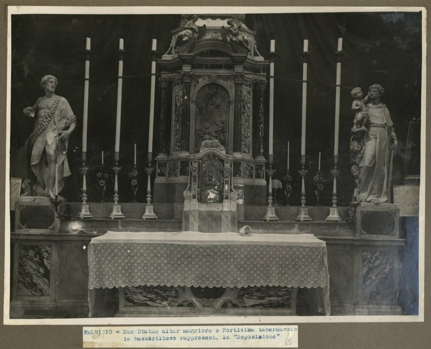 MALNISIO = Due Statue altar maggiore e Porticina tabernacolo in bassorilievo rappresentante la "Deposizione"