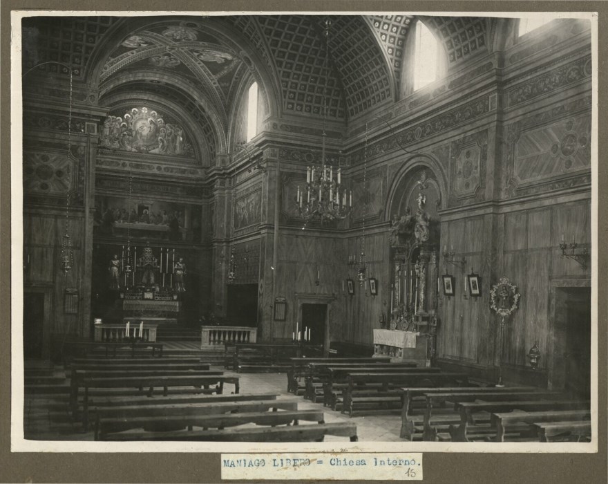 Veduta dell'interno della Chiesa dei Santi Vito, Modesto e Crescenzia Martiri di Maniago libero: risalente al 1781-82 la nuova chiesa, sono visibili agli affreschi con motivi geometrici a finto marmo ad opera del pittore e restauratore Tiburzio Donadon nel 1927. Nel presbiterio l'affresco de "L'ultima cena" del 1922 e ad opera di Leonardo Moretti. E' un edificio ad impianto basilicale, a navata unica; il presbiterio è senza abside e vede due altari laterali collocati entro rientranze nelle pareti laterali.