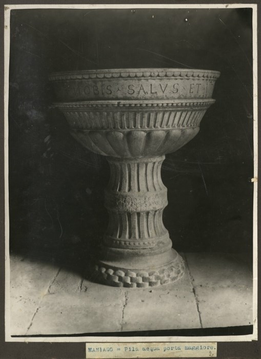 Acquasantiera o pila dell'acqua santa in pietra conservata accanto al portale maggiore presso la Chiesa di San Mauro Martire, ovvero il Duomo, di Maniago.