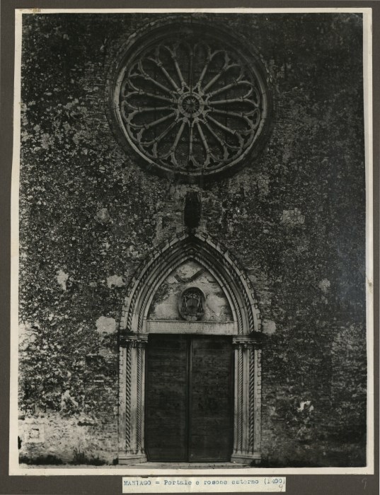 Nell'immagine una parte della facciata del Duomo di Maniago: un grande ed elegante rosone, simile a quello presente nella chiesa di Sant’ Antonio abate di San Daniele, si compone di diciotto archetti trilobi che incrociandosi creano dei pennacchi con foglia triloba ed è contornato da una robusta cornice con bordo esterno dentellato. Nella lunetta del portale è appena visibile un affresco, coperto da una scultura che riporta uno stemma. Il portale è finemente ornato con due colonnine tortili terminanti con capitelli corinzi tra cui occhieggiano due testine.